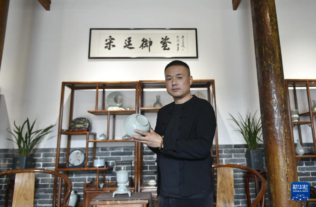 10月22日,河南省汝州市“宋京御窑厂”的汝瓷艺人赵永恒在展厅里展示汝瓷作品。