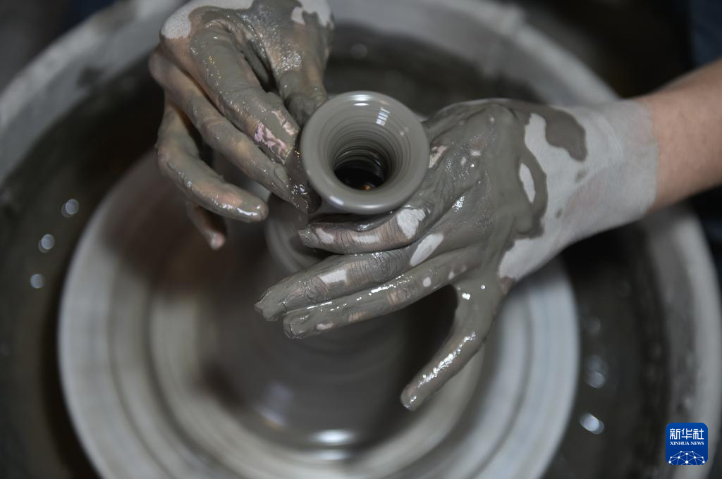 10月22日,河南省汝州市一家汝瓷生产企业的工作人员在工坊里拉坯。