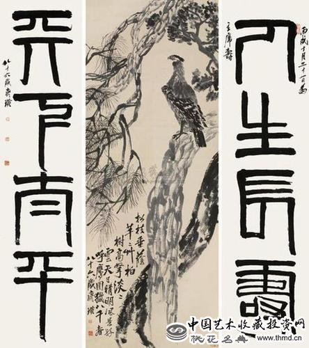 拍品介绍:齐白石代表作《松柏高立图·篆书四言联》,长266厘米,宽100厘米,为历年公私所见齐白石最大尺幅绘画及书法精品。图绘雄鹰傲然立于苍松之上。松鹰是齐白石最喜欢的画题之一,“鹰”寓意“英雄”,刚健有力,而“松柏”则有长寿之喻。所匹配的篆书“人生长寿,天下太平”对联,单幅纵264.5厘米,横65.8厘米,画面气势宏伟,与之匹配的篆书四言联,则浑厚自然、端庄大气,堪称齐白石书法精品。白石老人此画创作于1945年抗战胜利后,其时画家86岁,正是齐白石艺术创作的成熟期。作品表达了画家对国家民族和平发展的美好祈望,当时为蒋介石六十寿庆所作。2005年由美国旧金山私人释出后流入大陆,此番亮相受到藏家热烈关注。