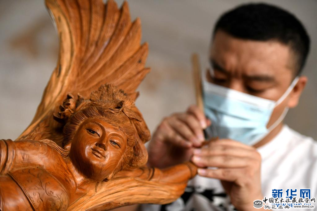 2021年8月11日,许红阳在河北省井陉县小作镇许氏木雕工作室创作。