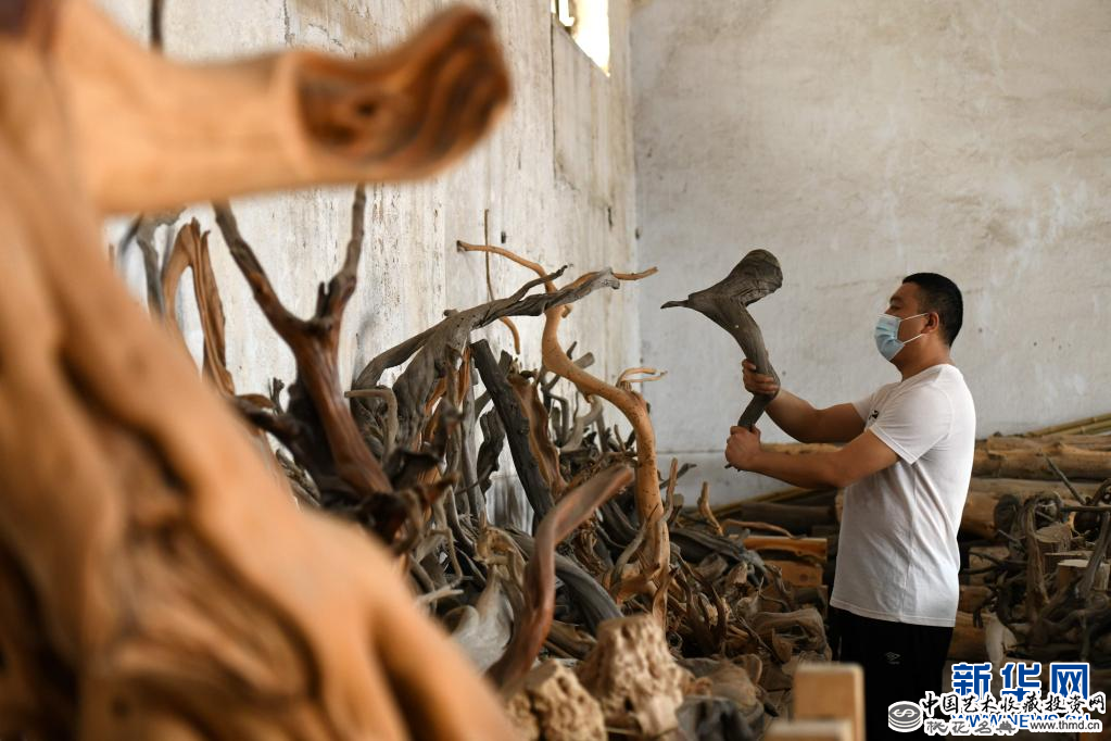 8月11日,许红阳在河北省井陉县小作镇许氏木雕工作室选料。新华社发(陈其保 摄)