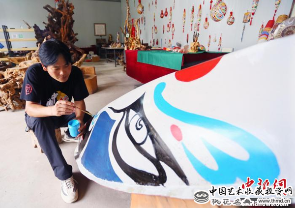图为马龙绘制大型梭子脸谱,属于马勺脸谱系列。 高展 摄
