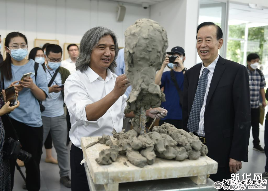 9月9日,中国美术馆馆长吴为山为西安电子科技大学教授郝跃(前右)塑像。新华社记者 鲁鹏 摄