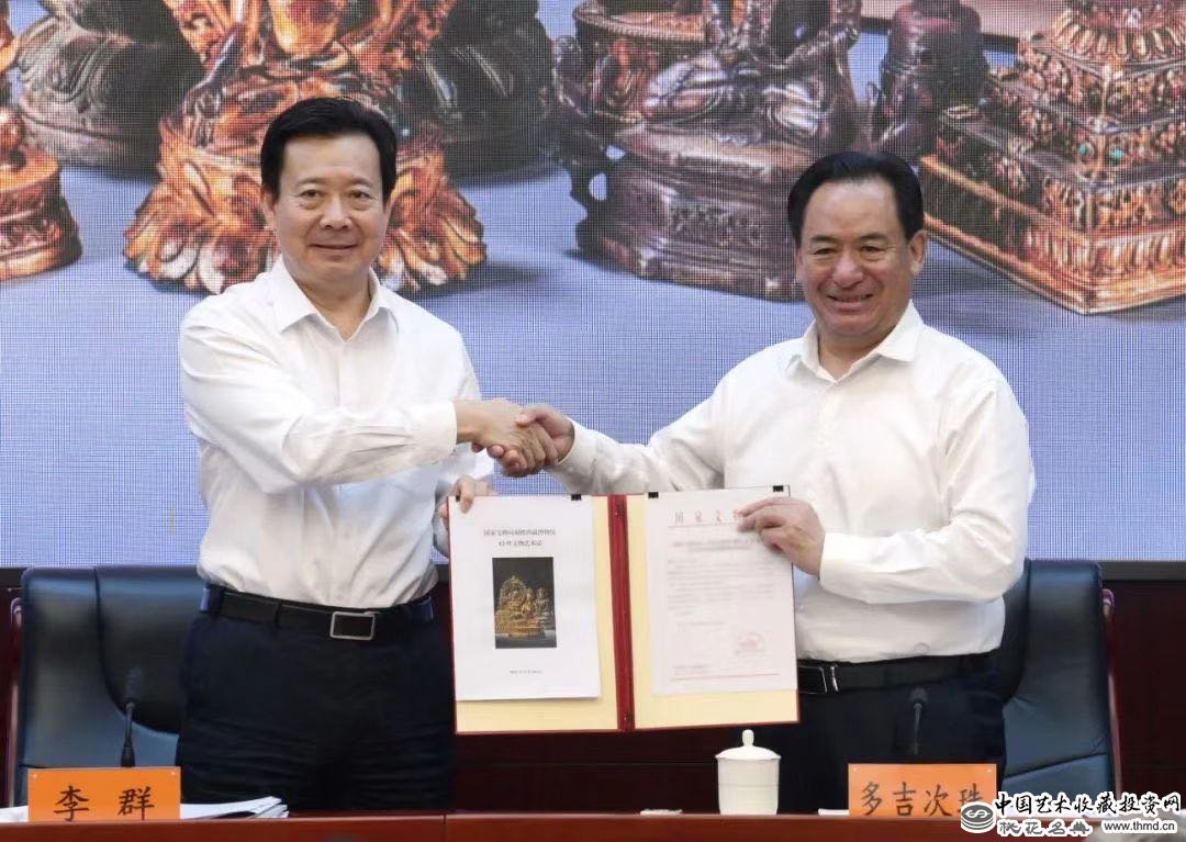 9月26日上午,全国文物援藏工作电视电话会议在京召开,文化和旅游部副部长、国家文物局局长李群与西藏自治区人民政府副主席多吉次珠交接文物划拨清册,将从美国成功追索回国的12件文物艺术品整体划拨西藏博物馆。