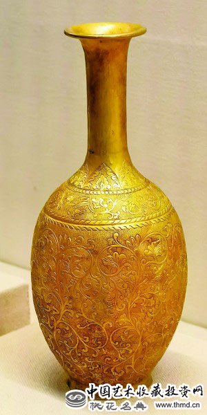 辽代缠枝花纹长颈金瓶,用以贮酒。