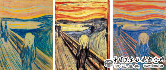 蒙克 《呐喊》 的不同版本,从左到右: 1893 蜡笔, 1893 油彩、坦培拉、蜡笔, 1895 粉笔
