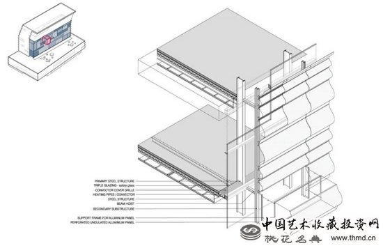 外部装饰着可回收利用的,穿孔程度不同的半透明波浪型铝板,有效的遮挡阳光,并折射阳光,不仅保护了艺术品,又引入了自然光源。