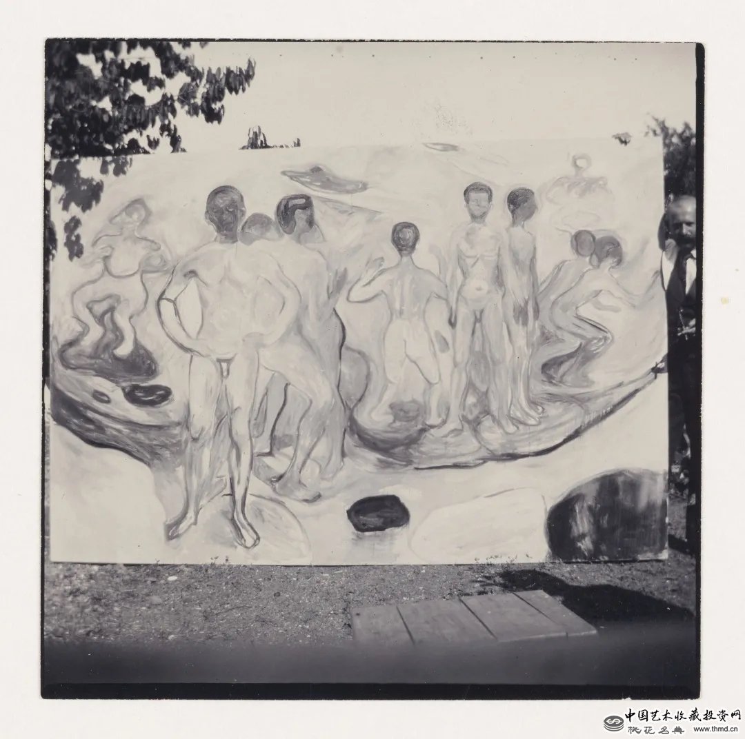 放在Åsgårdstrand花园里的画作《Bathing Young Men》。Photo © Munchmuseet