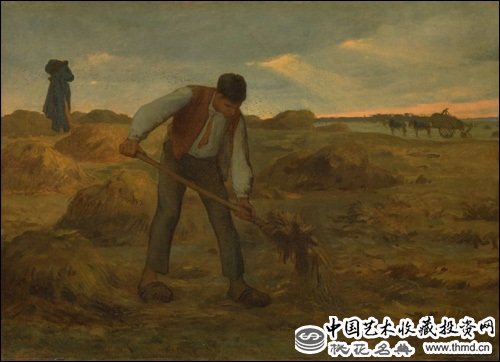 这幅画主要由金黄与褐红的基调构成,一个法国农民站在大地的原野上,此刻他正在弯着腰神态专注地给地里施肥。他身穿月灰色上衣和一件橘红色坎肩,一条暗灰色的裤子使他的一双鞋子又大又笨拙,而土地此时是沉默的。这个农民的身后堆放着五个褐色的草垛。其中稍远一点的一堆草垛上竖着一把木杈,木杈的柄上挂着那个农民的一件橄榄灰的衣袍和一顶黑褐色的草帽。远方是一座起伏的群山吗?天空浓重的灰云层正压迫着黄昏的晚霞,但晚霞仍在从远方村庄的剪影上燃烧着它最后的依恋和斑斓。那个农民双手握着农具仍在继续铲草,他不知道他身后原野上的那辆马车快要回村了,马车已装满了草和归晚的暮色,两匹灰马站在大地的空气中等待着马车上那个垛草人的影子,使这个施肥的农民的身影显得的孤单而诗意。