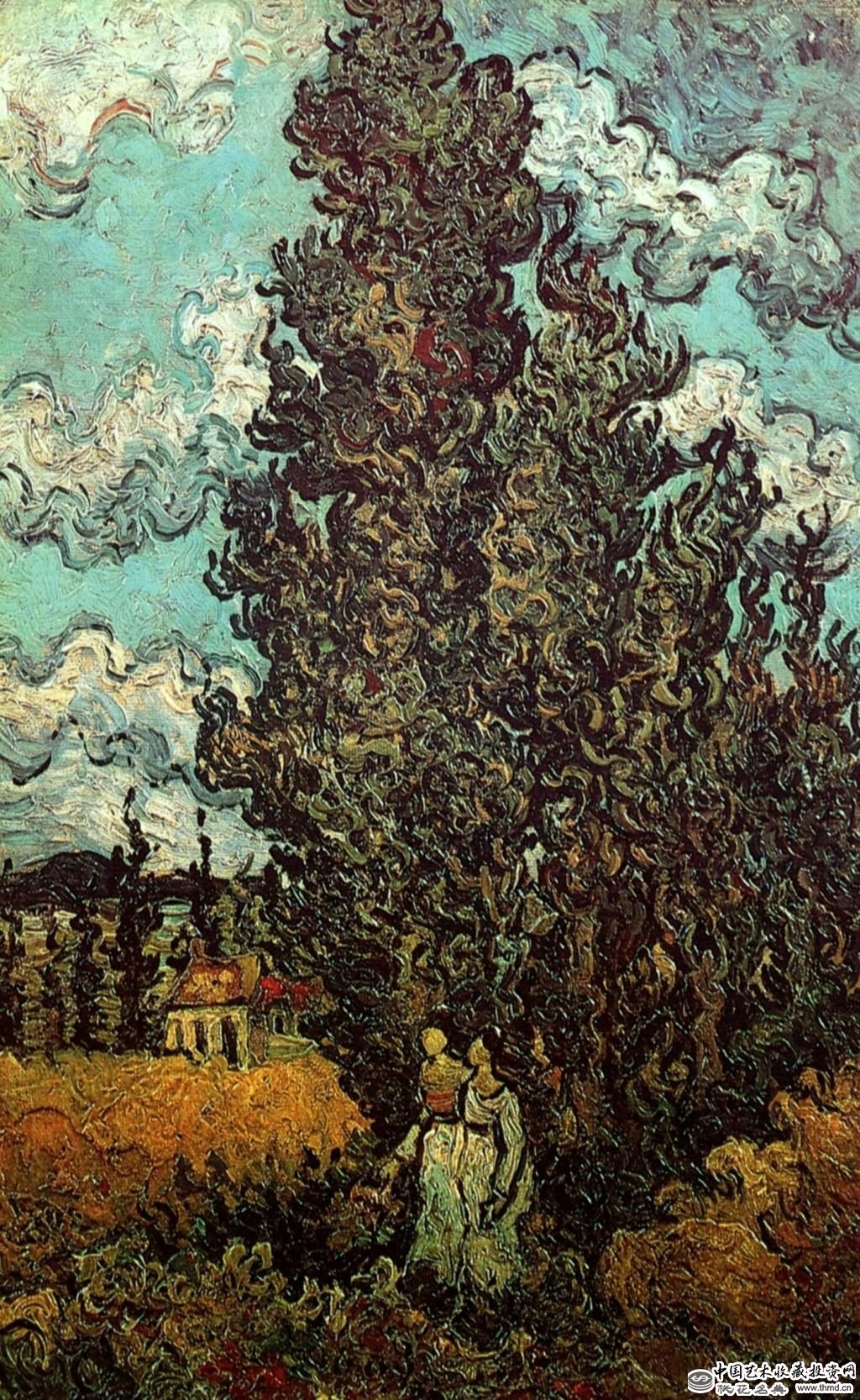 梵高的宇宙,可以在《星夜》中永存。这是一种幻象,超出了拜占庭或罗曼艺术家当初在表现基督教的伟大神秘中所做的任何尝试。梵高画的那些爆发的星星,和那个时代空间探索的密切关系,要胜过那个神秘信仰的时代的关系。然而这种幻象,是用花了一番功夫的准确笔触造成的。当我们在认识绘画中的表现主义的时候,我们便倾向于把它和勇气十足的笔法联系起来。那是奔放的,或者是象火焰般的笔触,它来自直觉或自发的表现行动,并不受理性的思想过程或严谨技法的约束。梵高绘画的标新立异,在于他超自然的,或者至少是超感觉的体验。而这种体验,可以用一种小心谨慎的笔触来加以证明。这种笔触,就象艺术家在绞尽脑汁,准确无误地临摹着他正在观察着的眼前的东西。从某种意义上看,实际确是如此,因为梵高是一位画其所见的艺术家,他看到的是幻象,他就是幻象。《星夜》是一幅既亲近又茫远的风景画,这可以从十六世纪风景画家老勃鲁盖尔的高视点风景手法上看出来,虽然梵高更直接的源泉是某些印象主义者的风景画。高大的白扬树战栗着悠然地浮现在我们面前;山谷里的小村庄,在尖顶教堂的保护之下安然栖息;宇宙里所有的恒星和行星在“最后的审判”中旋转着、爆发着。这不是对人,而是对太阳系的最后审判。这件作品是在圣雷米疗养院画的,时间是1889年6月。他的神经第二次崩溃之后,就住进了这座疗养院。在那儿,他的病情时好时坏,在神志清醒而充满了情感的时候,他就不停地作画。色彩主要是蓝和紫罗兰,同时有规律地跳动着星星发光的黄色。前景中深绿和棕色的白杨树,意味着包围了这个世界的茫茫之夜。